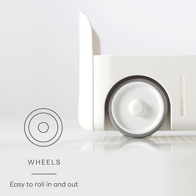 - WHEELS IN AND OUT: Large, smooth-spinning wheels with soft-grip surface roll the caddy in and out while protecting cabinet floors under the sink.