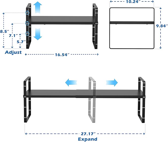 - Expandable Length -Measure:16.54” to 27.17”Lx 10.24”W x 9.84”H,the length of the shelf organizer can be stretched from 16.54 inches to 27.17 inches.