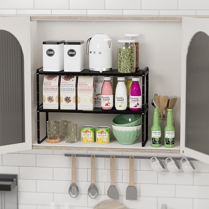 SANNO Expandable Kitchen Shelf Organizers, Stackable Cabinet Shelf Organizer Storage Rack, Countertop Organizer Kitchen Pantry Cupboard Pantry,Black, 10" W, 1 Pack