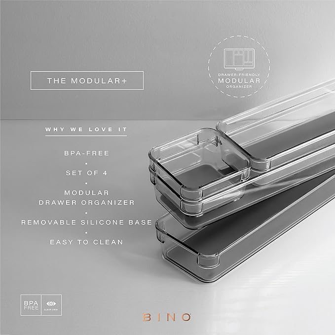 BINO | 4-Piece Drawer Organizer Bin Set - Navy, Small | THE MODULAR+ | Multi-Purpose Storage | Soft-Grip Lining and Non-Slip Rubber Feet | Durable | BPA-Free | Desk Drawer Organizer | Vanity Organizer