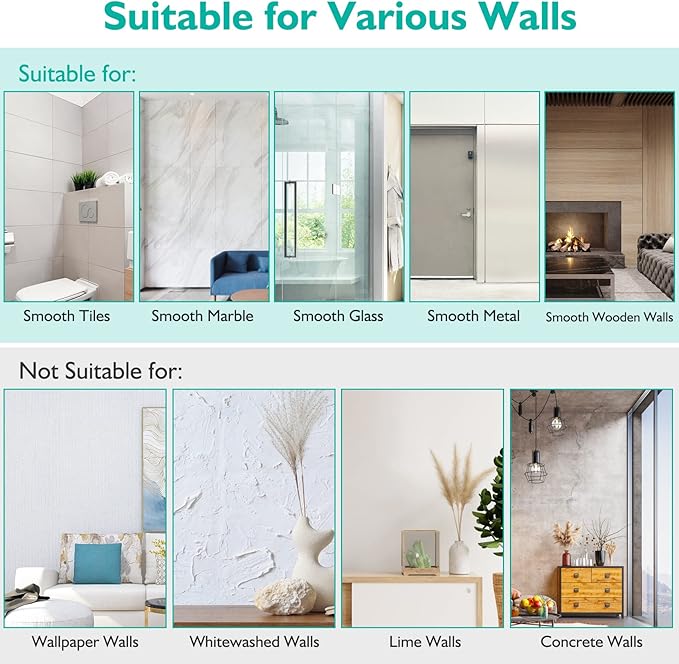 - Suitable for Various Walls: Smooth tile, marble, tempered glass, wood wall, and solid metal are all suitable for installing this bathroom shower organizer. Suitable for bathroom, toilet, kitchen, powder room, etc. Wallpaper wall, stucco wall, lime wall, or concrete wall is not recommended. This corner shower caddy includes 2 × adhesive shower caddies, 1 × soap holder, 5 × adhesive stickers, 1 × user manual