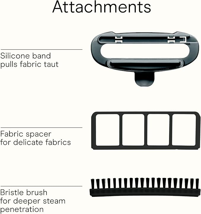 - 3-IN-1 ATTACHMENT: This portable steamer for clothes includes a silicone band to pull fabric taut, a delicate fabric spacer to protect trims and fine fabrics, and a bristle brush to ensure steam penetrates fibers for a perfect press, even on heavy fabrics.