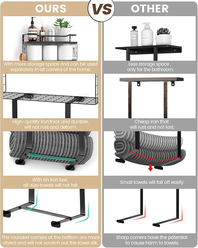 - Bathroom Decor with SPA-Like Vibes - Our towel holder allow you to roll up towels and store them in a professional and clean display. The floating shelf is perfect for placing small bathroom accessories like candles or small plants for cozy spa-like vibes.
