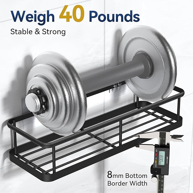 - 【Strong Adhesives, Weight up to 40 Pounds】 - The adhesives of the shower caddy is super strong, allowing the wall-mounted shower holder to hold 40 pounds with greater stability. Keep bottles stably in the shower basket in the bathroom so they are easy access. After installed correctly, there is no need to worry about dropping