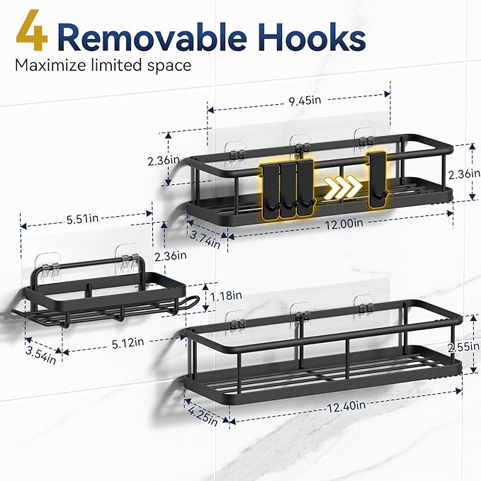 - 【3 Pack Shower Organizers with large capacity】 - The shower shelf consists of 3 pieces, including 2 shower caddies, 1 soap holder, and 3 adhesives. Large capacity can easily accommodate toiletries or cooking seasonings to facilitate your life. Maximize storage with minimal space usage for organizing bathrooms / toilets / kitchens / RVs / bedrooms / living rooms / laundry, etc
