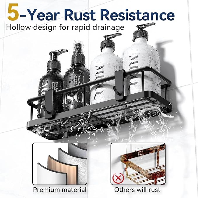 - 【Durable Metal, Rustproof Design】 - The bathroom shower organizer is made of high quality metal and high temperature paint technology, which is durable, rust resistant, waterproof, and scratch resistant. Can stay with you for up to 6 years. Hollow design at the bottom, good ventilation and drainage, convenient cleaning. Keep shower shelves and bathroom necessities dry