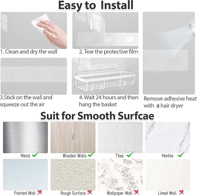 - No Drilling Installation: Liuoud shower rack for inside shower simply needs stick adhesive on the wall and hang the shelf to use. No drilling, no damage to your wall. taking all 5 minutes without any tools needed