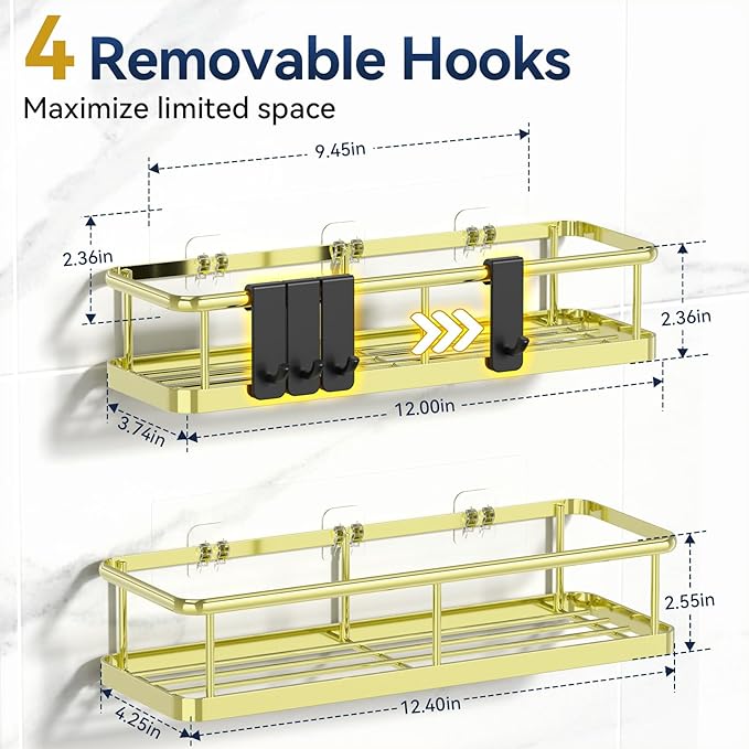 YASONIC Shower Caddy Adhesive, No Drill Bathroom Shower Organizers, with Removable Hooks, Rust Proof Shower Shelves, Wall-Mounted Shower Holder, 2 Pack Gold