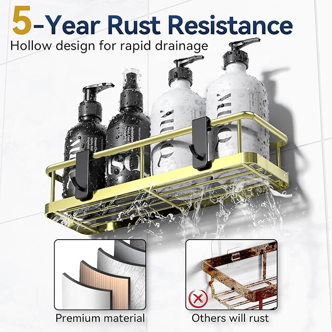 - 【Durable Metal, Hollow Drain Design】The bathroom shower racks are made of high quality metal, high temperature paint process, durable; Passed the 48-hour salt spray test, rust resistant, waterproof, scratch resistant, can accompany you for up to 5 years. Hollow design at the bottom, good ventilation and drainage, convenient cleaning. Keep shelves and bathroom necessities dry