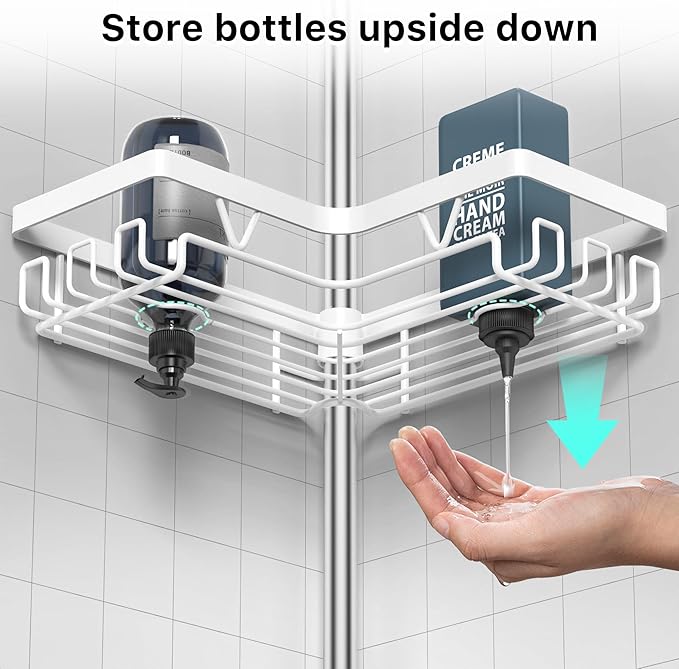 - 4-Tier Oversized Corner Shower Shelf: This shower organizer features 4 spacious tiers with generously sized trays designed to hold multiple bottles per shelf. Perfect for storing bath essentials like shampoo, soap, conditioner, and body wash—plus bonus hooks for hanging loofahs, razors, and more. Requires no drilling and leaves walls pristine, with adjustable height settings and detachable baskets to customize your storage.
