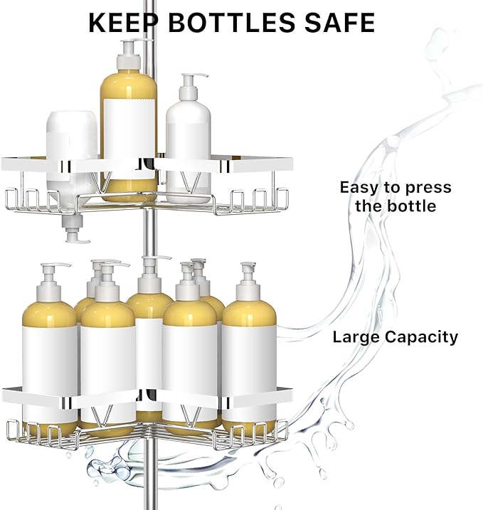 - Wide Height Range, No Drilling Needed - Corner shower caddy tension pole adjusts from 25" to 114.2", perfect for apartments, rentals, or families who prefer no wall damage. Fits most showers — from tub corners to floor-to-ceiling setups