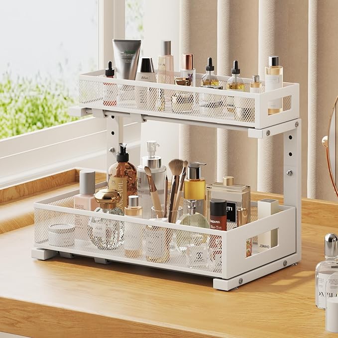 - 【2-Tier Pull-Out Design for Easy Access】This under-sink organizer features a double-layer pull-out design, allowing you to easily access items at the deepest part. The upgraded, thickened iron circular sliding rails ensure a smooth and seamless pulling experience, making each use effortless. The unique pull-out locking mechanism effectively prevents the drawers from being completely pulled out, avoiding the risk of items falling or structural damage caused by over-pulling, ensuring safer and more convenient use.