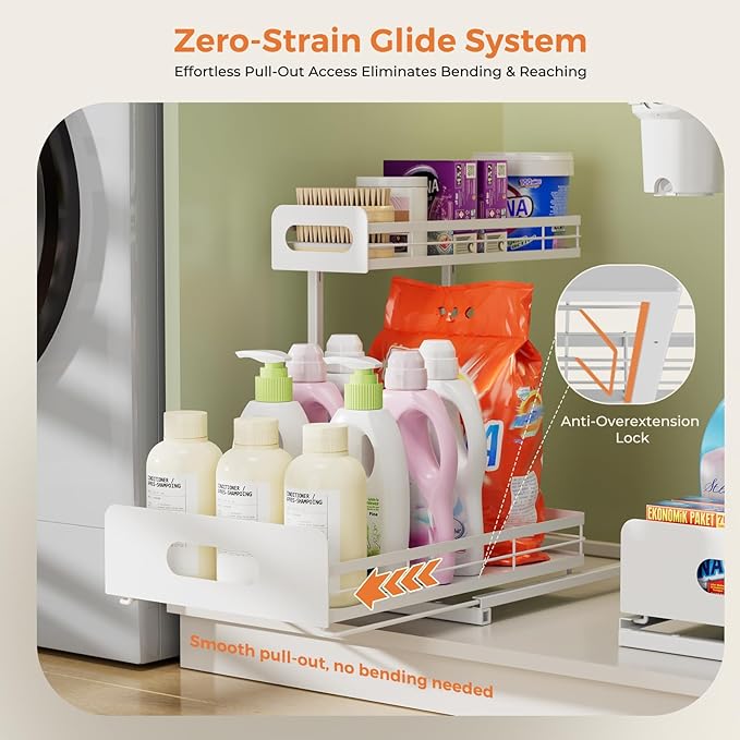 - Sliding design with anti-drop hooks: Upgraded smooth sliding allows you to easily access items stored behind the organizers without bending or kneeling. The expandable baskets are fitted with anti-drop hooks underneath to prevent accidental slipping