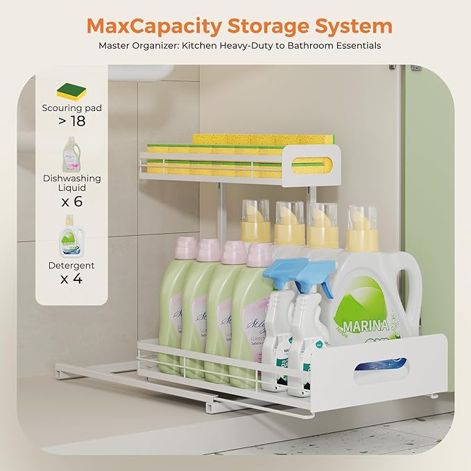 - Sturdy & L-shaped Design: Extra-thick reinforced steel and L-shaped structure optimize space under the sink and boost load capacity. Reinforced edges prevent wobbling, supporting up to 50 lbs for long-term use in kitchens, bathrooms or laundry rooms