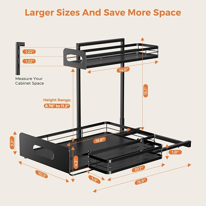 - Three-height adjustable design: 3 adjustable heights (12.8“-14”-15.2") easily fit 99% of cabinet & item sizes, and the shelves can be easily repositioned to accommodate extra-large spray bottles to optimize vertical space