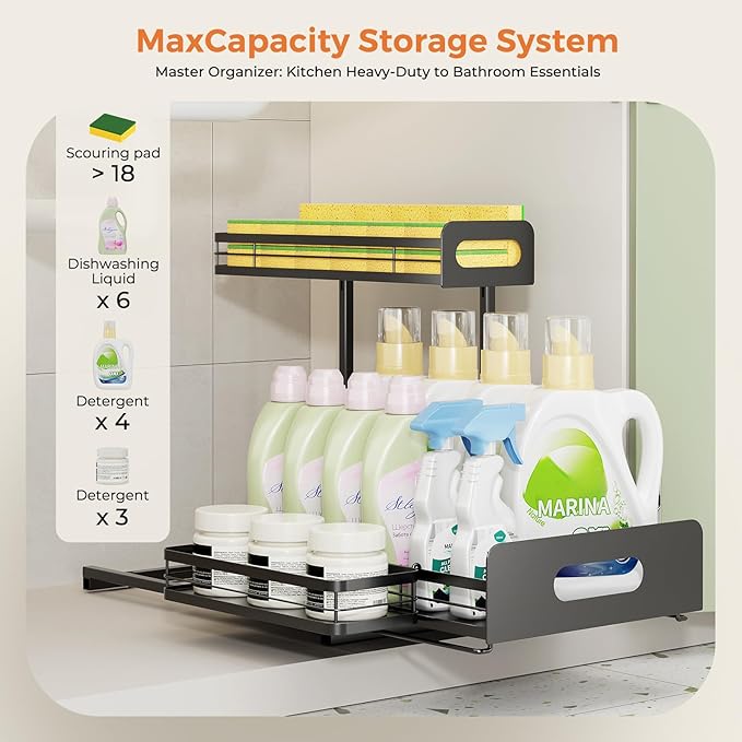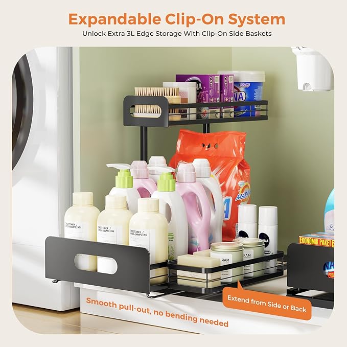 - Hook-On Extra Storage Baskets: Delamu under sink organizers and storage includes a compact accessory basket that neatly stores sponges, brushes or other small items. This dedicated compartment reduces clutter and keeps frequently needed tools within reach while maximizing storage efficiency