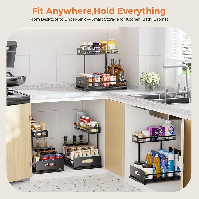 - Sturdy & L-shaped Design: Extra-thick reinforced steel and L-shaped structure optimize space under the sink and boost load capacity. Reinforced edges prevent wobbling, supporting up to 50 lbs for long-term use in kitchens, bathrooms or laundry rooms