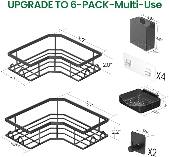 - 【Ample Storage with 6-Piece Hanging Shower Organizer Set】Maximize your storage space with our comprehensive bathroom organizer set. Comprising 6 versatile pieces, it includes 2 spacious shower caddies, 1 sleek soap holder, 1 convenient toothbrush holder, and 2 stainless steel adhesive hooks. Perfect for bathrooms, kitchens, or toilets, this set effortlessly accommodates all your toiletries, cooking seasonings, and more. Keep your space immaculately clean and organized.