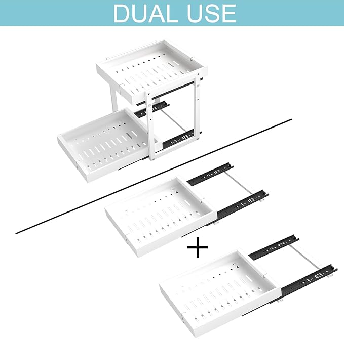 - ๐๐๐ฃ๐ฎ๐ฌ๐ญ๐๐๐ฅ๐ ๐๐ข๐๐ญ๐ก & ๐๐ฎ๐๐ฅ-๐๐๐ฒ๐๐ซ ๐๐ฌ๐: This 2-tier pull out cabinet organizer expands from 13.5" to 19.8" to fit various cabinets. The top tier features 3 height settings, and both tiers can be used together or separatelyโperfect for flexible organization and storage in kitchens and bathrooms.
