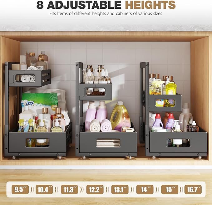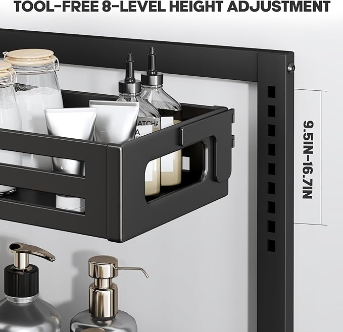 - 【8-Level Tool Free Height Adjustable】With a hook-style top basket,no screws are needed—just hang and adjust the height (9.5–16.7 in) to fit bottles of all sizes and different pipe clearances in seconds.