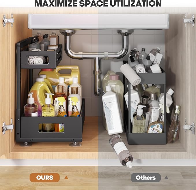 - 【Smart Use of Vertical Space】L-shaped design with a narrow top and wide base cleverly avoids pipes and garbage disposers while maximizing upper space for small items.The bottom tier offers ample space for bottles of different heights.Dual-layer categorized storage solves the problem of clutter and hard-to-search items under the sink,boosting space efficiency by up to 180%.