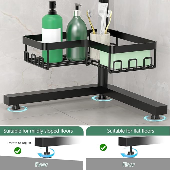 - Stable and Secure Design: This floor shower caddy features adjustable feet to keep it stable even on uneven floors. The sticky pad on top secures it to the wall, preventing tipping and ensuring long-lasting stability