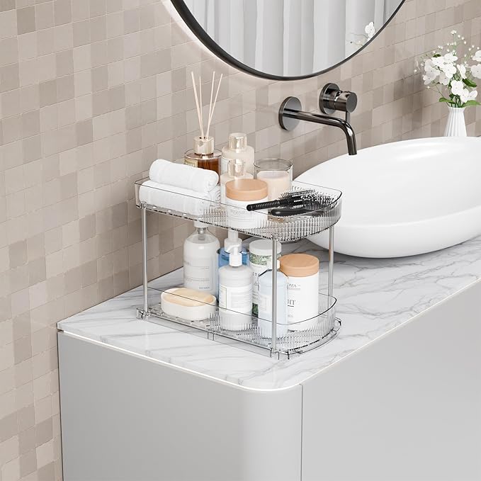 - 【Durable/Multi-Purpose】the plastic under counter organizer transparent design allows you to easily find what you need. Saving time and keeping everything organized,which is both practical and beautiful,Very suitable as bathroom under sink organizer,under cabinet organizer,under counter storage organizer,under vanity storage organizer,u der sink organizer,pull out storage organizer