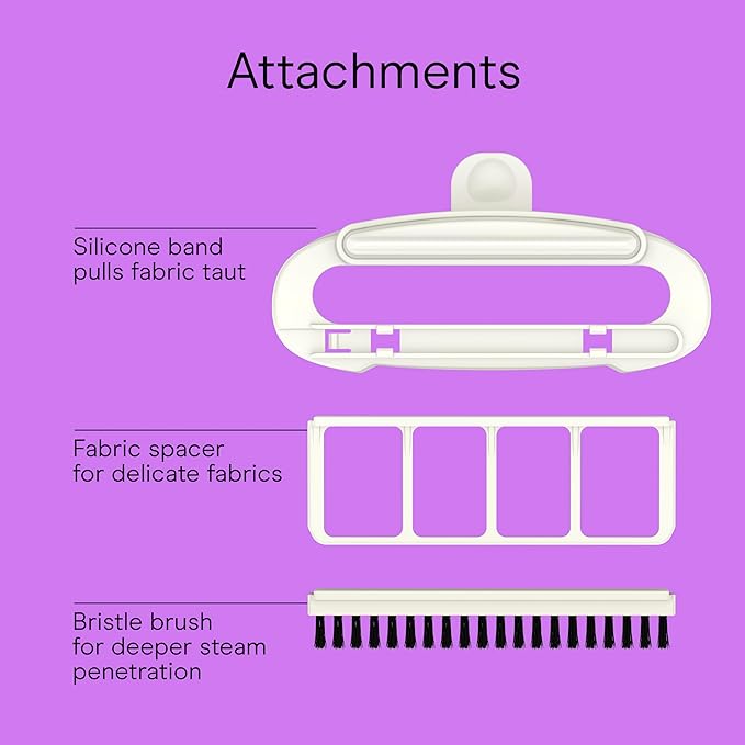 - 3-IN-1 ATTACHMENT: This portable steamer for clothes includes a silicone band to pull fabric taut, a delicate fabric spacer to protect trims and fine fabrics, and a bristle brush to ensure steam penetrates fibers for a perfect press even on heavy fabrics.