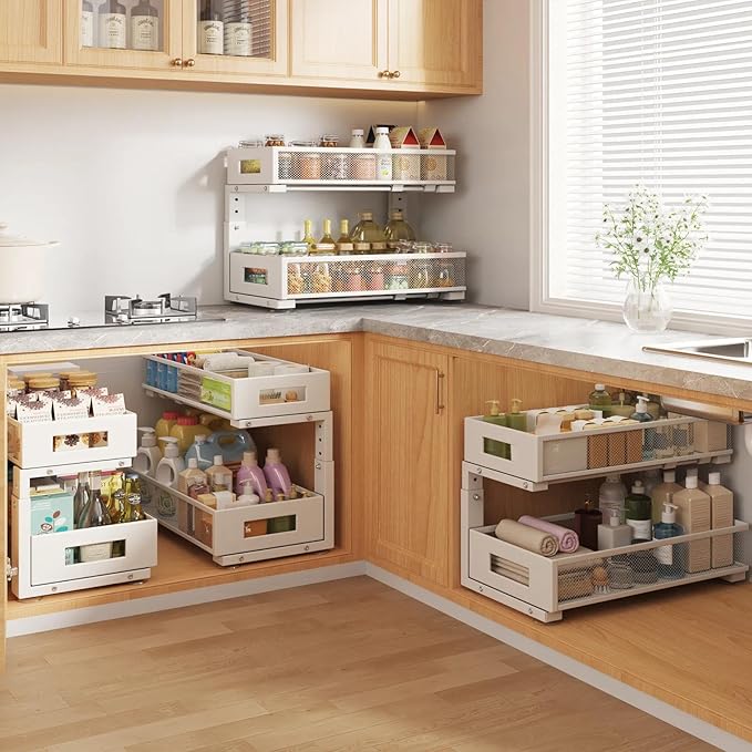 - 【Versatile Storage】The spacious dual pull-out drawers and fine mesh design make it perfect for storing cleaning supplies, toiletries, kitchen essentials, skincare items, and more. Ideal for kitchens, bathrooms, laundry rooms, or any space that needs organized storage.