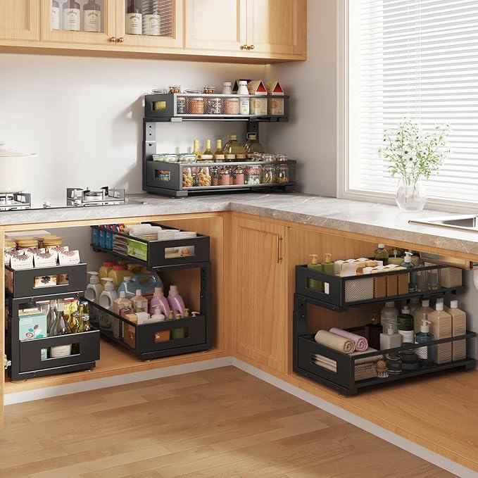 - 【Versatile Storage】The spacious dual pull-out drawers and fine mesh design make it perfect for storing cleaning supplies, toiletries, kitchen essentials, skincare items, and more. Ideal for kitchens, bathrooms, laundry rooms, or any space that needs organized storage.