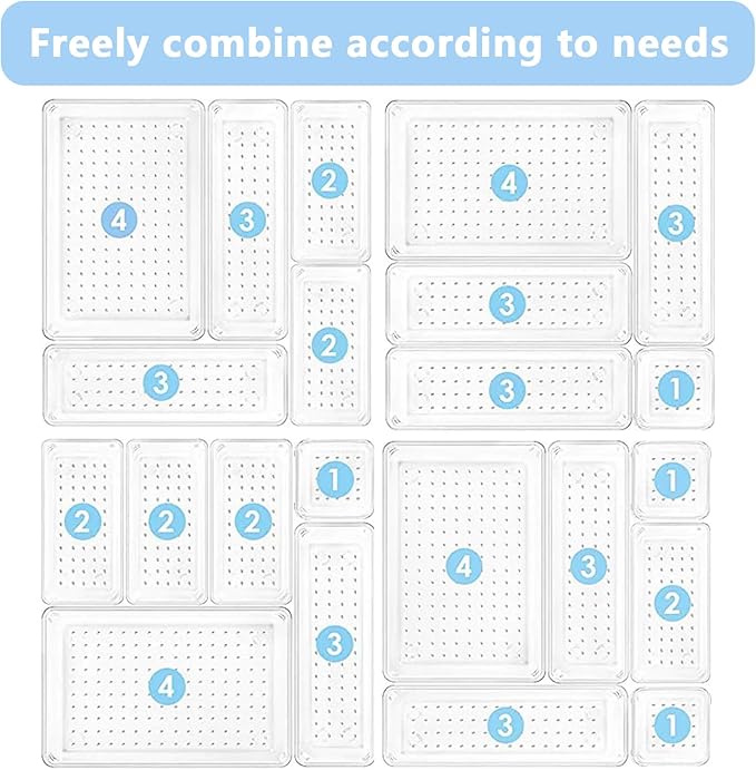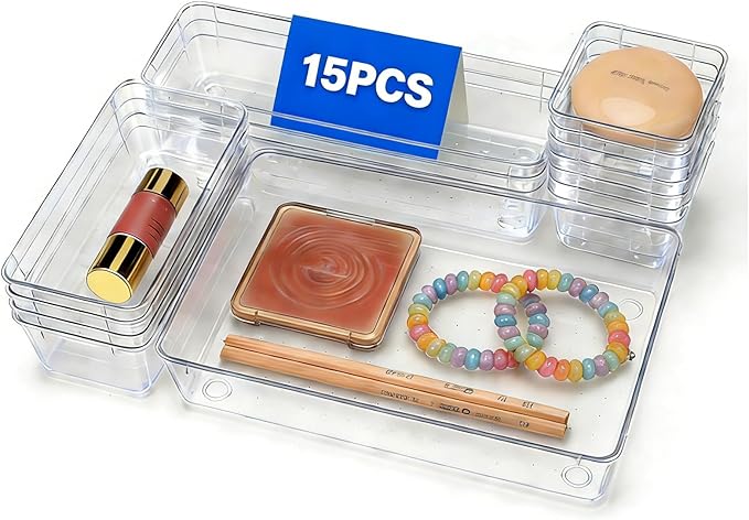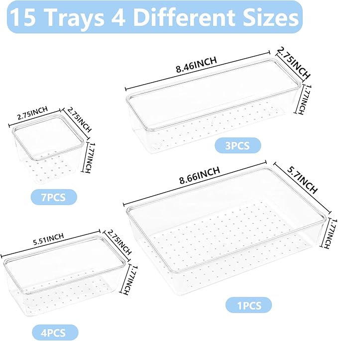 - 4 Different Sizes: 15 acrylic drawer organizer in 4 different sizes can be freely arranged in the drawer. There are numerous combination possibilities. The makeup storage organizer eliminates scattered small items and helps keep your drawer neatly organized. and toiletries.Package contents: 8.6 x 5.7 x 1.75 inches (1pcs), 8.5x2.75x 1.75inches (3pcs), 5.7 x 2.75 x 1.75 inches(4pcs), 2.75 x 2.75 x1.75 inches(7pcs).