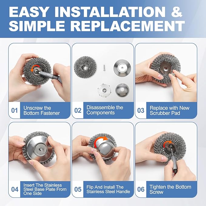 - 【Ergonomic Handle】Steel wool scrubber with handle is uniquely designed to fit comfortably in the hand.With this thoughtful design,users can avoid direct contact with grime and detergent,providing effective protection for the skin on your hands.