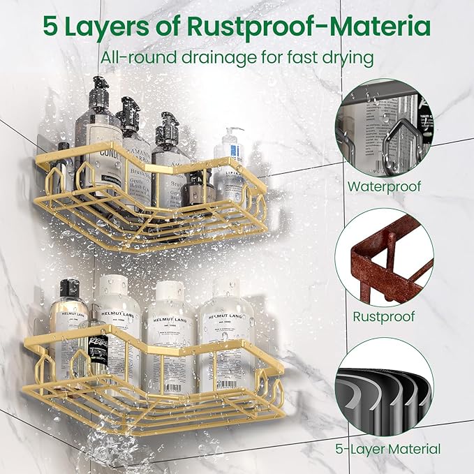 - 【Premium Metal Construction for Long-Lasting Durability】Crafted from top-notch carbon steel, our corner shower caddy is built to withstand the test of time. The rust-resistant properties and thicker, solid frame ensure stability and reliability. Thanks to the high-temperature baking paint process, it features a surface that's not only durable but also waterproof and scratch-resistant. Even in the most humid environments, you can expect this shower shelves to serve you well for up to 8 years. Its innovative hollow design promotes excellent ventilation, making it a breeze to clean and maintain.