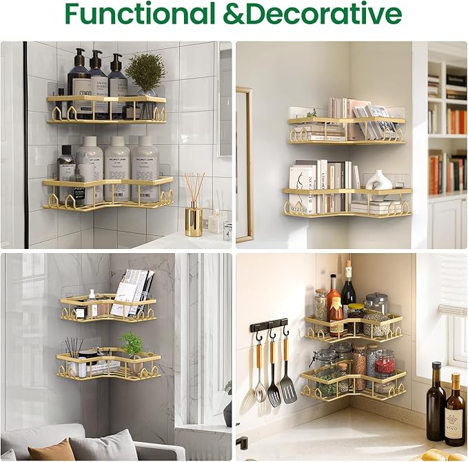 - 【Versatile Application for Multiple Scenarios】This shower corner shelf isn't just limited to the bathroom. It's a versatile storage solution that's perfect for toilets, RVs, kitchens, laundry rooms, and more. It adheres well to most smooth surfaces, including smooth tiles, tempered glass, and wooden walls, making it suitable for a wide variety of settings. Enjoy the flexibility and convenience of having a functional and stylish storage option wherever you need it.