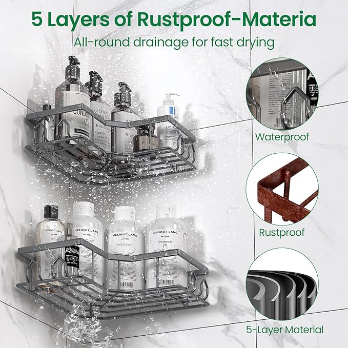 - 【Premium Metal Construction for Long-Lasting Durability】Crafted from top-notch carbon steel, our corner shower caddy is built to withstand the test of time. The rust-resistant properties and thicker, solid frame ensure stability and reliability. Thanks to the high-temperature baking paint process, it features a surface that's not only durable but also waterproof and scratch-resistant. Even in the most humid environments, you can expect this shower shelves to serve you well for up to 8 years. Its innovative hollow design promotes excellent ventilation, making it a breeze to clean and maintain.